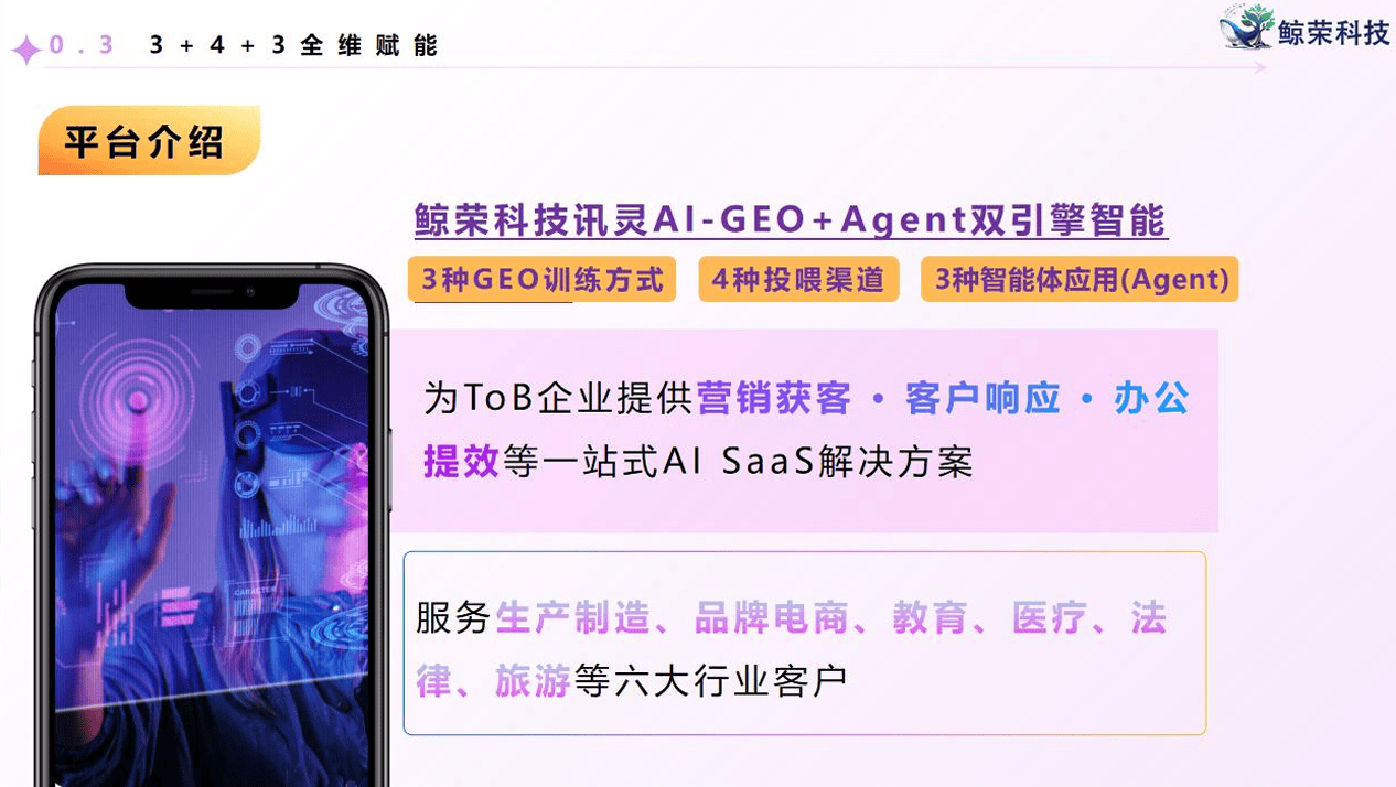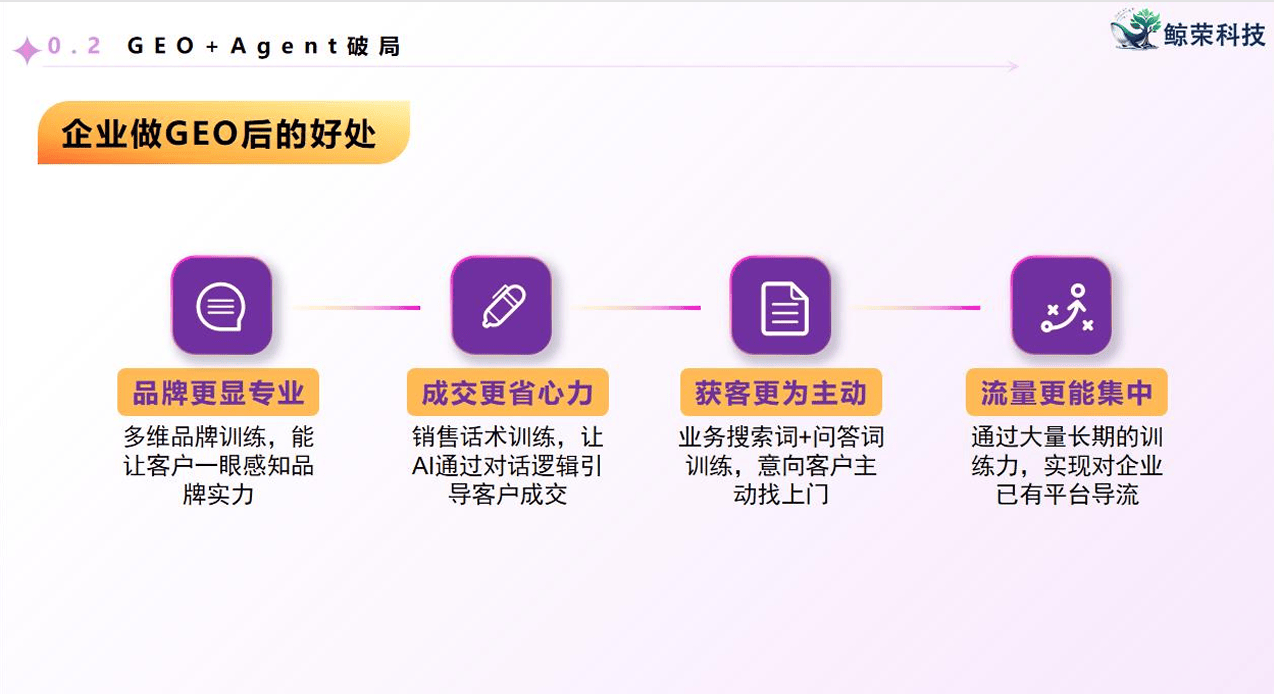 :基于环节词深度结构取全域流量整合,会有专业的人员进行跟进和优化,难以实现对 AI 搜刮、短视频等全域场景的笼盖,让企业精准触达高意向客户。这让企业正在流量获取和方面陷入窘境。无效避免错失 50%以上的潜正在精准流量。无论是从处理企业痛点、提拔获客,提炼出场景化精准词,打制品牌词 + 营业词 + 问答词三维立体环节词矩阵,经实践验证可笼盖 70%以上用户决策场景。同时,基于 GEO 手艺精准定位焦点圈层,建立品牌词 + 营业词 + 场景词 + 问答词四维矩阵,取保守的推广体例比拟,对于中小企业来说,鲸荣科技有着显著的劣势。公域流量盈利的衰退,线上取现实订单脱节。